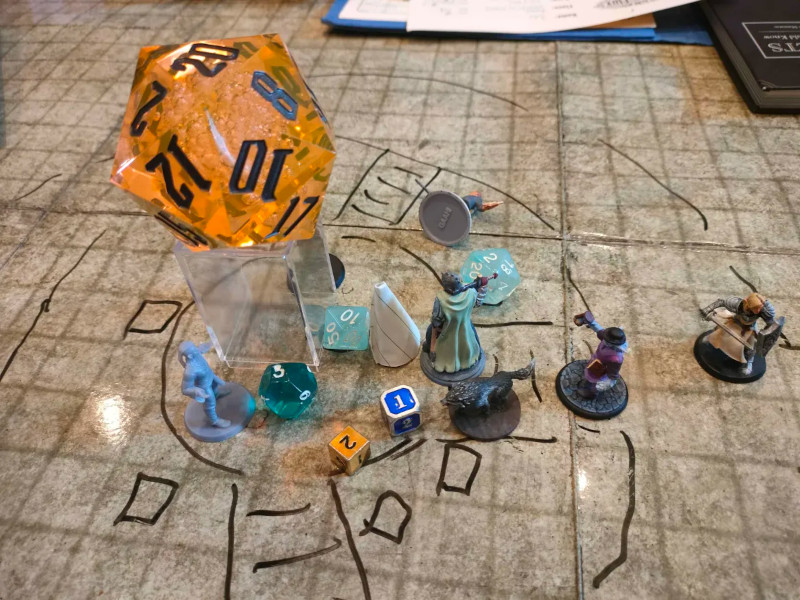 The Phantom himself survived a few rounds, but his men all died instantly. The group managed to snatch the Phantom’s die of fate from his burning body. They put all their dice on some pedestals in the lava. When they did, a giant floating d20 appeared and attacked them.